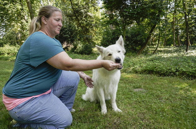 4. Sobald dein Hund aufgestanden ist und mit geraden Beinen vor dir steht, lobst du ihn und gibst ihm das Leckerli. Danach folgt dein Auflösesignal, die Übung ist beendet.