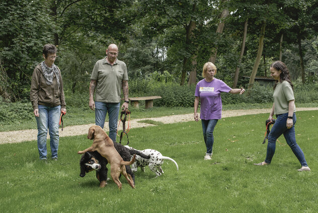 Kommt der Welpe in seine neue Familie, fehlen ihm seine Geschwister, mit denen er toben kann. Doch Welpen brauchen Sozialkontakt, also geht es ab in die Welpengruppe. Eine Stunde pro Woche trifft der kleine Welpe nun seine Artgenossen. Da ist es nicht ungewöhnlich, dass er „berauscht“ vor lauter Freude kein Ende im Spiel findet. In einer guten Hundeschule achten Trainer:innen daher darauf, dass es nach ca. 10 - 15 Minuten Spiel eine Pause gibt, in welcher z. B. die Fragen der Halter:innen beantwortet werden. Gäbe es keine Pause, würden einige Welpen mit Sicherheit toben, bis sie umfallen. Aber wie ist das mit Chantal und Kevin, wenn diese in den Kindergarten gehen? Hier wird ja auch nicht eingegriffen und den Kindern das gemeinsame Spiel untersagt. Doch wenn die beiden, kaum im Kindergarten angekommen, herumrennen, sich balgen, toben und das ohne Pause, bis sie wieder abgeholt werden, würde sich mit Sicherheit der ein oder andere Erziehende Gedanken machen und das Gespräch mit den Eltern suchen. Und letztlich ist das Zusammentreffen der Kinder im Kindergarten, tagtäglich über mehrere Stunden im Zeitraum von gut zwei bis drei Jahren kaum zu vergleichen mit dem einmal in der Woche stattfindenden einstündigen Besuch des Welpen in der Welpengruppe. Doch es gibt noch einen weiteren Unterschied: Kevin und Chantal werden in etwa im gleichen Alter sein: vier bis fünf Jahre. In der Welpengruppe tummeln sich Welpen im Alter von acht bis ca. 16 Wochen. Die Entwicklung des Welpen schreitet jedoch viel schneller voran als beim Menschen, sodass sich ein acht und ein 16 Wochen alter Welpe in vollkommen unterschiedlichen Entwicklungsphasen befinden. Zudem unterscheiden sich die Gewichte der Welpen enorm, von wenigen 100 Gramm bis guten 10 kg ist alles dabei. Selbstverständlich muss eine gute Hundeschule darauf achten, dass die Welpen in einer Welpengruppe zueinander passen. Bei der großen Diversität unserer Rassen sind ungefähr gleiche Gewichte jedoch fast unmöglich.