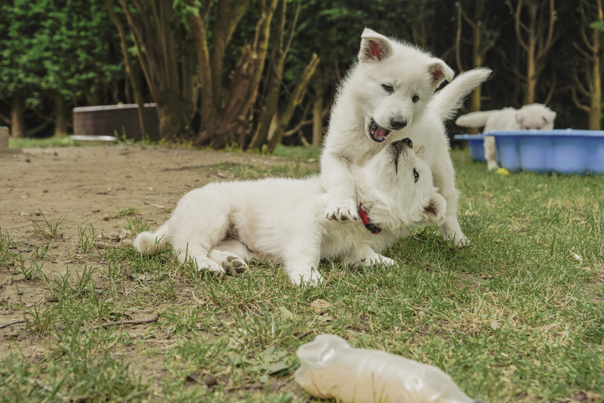 Wie sieht denn eigentlich das Spiel der Welpen in den ersten Wochen der Aufzucht aus? Alle Welpen werden in etwa gleichzeitig wach und das muntere Spiel beginnt. Da wird getobt, gekämpft, gerannt, ohne Pause und ohne Rücksicht auf irgendwelche Gelenke. Nach ca. 10 – 15 Minuten werden die ersten Welpen ruhiger, ziehen sich zurück. Das Spiel wird langsamer, weniger dynamisch, die ersten legen sich hin und nach spätestens einer halben Stunde schlafen alle für mindestens zwei bis drei Stunden, bevor es dann wieder losgeht mit der Aktivität. Auch bei den Wolfswelpen läuft es ähnlich ab. Zudem verbringen sie, bis sie erwachsen werden, den ganzen Tag mit ihren Geschwistern zusammen und können mit ihnen kommunizieren, spielen und sich bewegen.