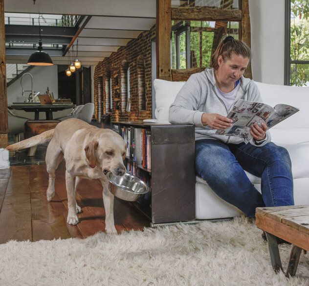 Nun stellt sich noch die Frage nach dem Futternapf. Auch hier gibt es ein unendliches Angebot. Metallnäpfe führen vor allem bei ängstlichen Hunden zu Verunsicherung, sodass sie nicht gern daraus fressen. Dies liegt zum einen am scheppernden Geräusch, das beim Kontakt mit dem Boden entstehen kann, zum anderen an der Spiegelung. Aber auch sichere Hunde fressen manchmal ungern aus Metallnäpfen. In dem Fall kann das Material Ursache sein, ähnlich dem Unbehagen, dass einige Menschen haben, wenn sie die Mahlzeit vom Lieferdienst mit einer Gabel direkt aus der Aluschale essen sollen. Keramiknäpfe sind in der Regel gut geeignet, allerdings können sie beim stürmisch fressenden Hund zu Bruch gehen. Das passiert nicht, wenn sie sich in einem Ständer befinden. Solche Ständer gibt es in vielen unterschiedlichen Designs, und hierbei darf gern der Geschmack der Halter:innen im Vordergrund stehen. Unnötig ist dagegen ein verstellbarer Futterständer. Ein gesunder Hund braucht keinen Futternapf auf Höhe seines Kopfes. Für Hunde ist es vielmehr natürlich, vom Boden zu fressen.