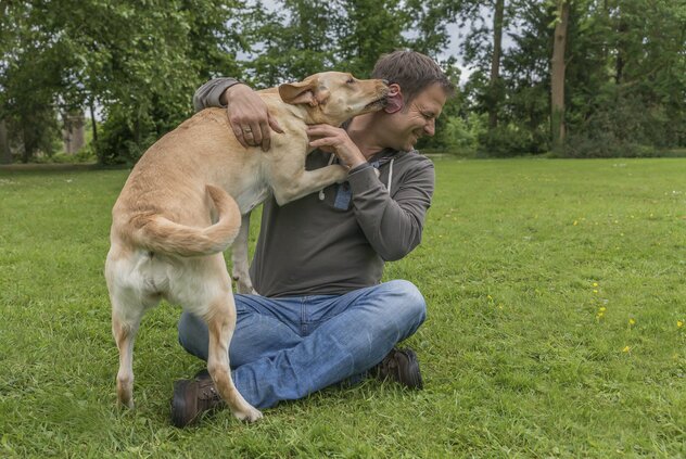 Nachts gelten im Übrigen ähnliche Regeln. Ich erinnere mich an die Zeit vor meiner Ausbildung bei Martin Rütter, als Buddy nachts noch die Wahl hatte, ob er oben bei mir im Schlafzimmer oder in seinem geliebten Körbchen unten in der Küche schlafen will. Da er die Küche sehr liebt (er ist ein Labrador und seine Liegestelle ist sehr nah am Kühlschrank), habe ich mir damals keine weiteren Gedanken darüber gemacht, welche Auswirkungen es haben könnte, wenn ich mich nach oben in mein Schlafzimmer zurückziehe, während er unten „Wache“ hält. Ich wunderte mich allerdings seinerzeit, dass er nachts nicht selten bellte. Während meiner Ausbildung zur Hundetrainerin wurde mir dann bewusst, dass ich ihm nachts die territoriale Verantwortung übertragen hatte und ihm suggerierte: „Pass du mal schön hier auf, ich gehe hoch ins Bett!“ Es soll nicht unerwähnt bleiben, dass gewisse territoriale Wesenszüge meines geliebten Vierbeiners diesen nächtlichen Aktivitäten mächtig in die Karten spielten. Also nahm ich ihn ab jetzt jeden Abend mit ins Schlafzimmer, er schlief in seinem Körbchen, ich in meinem Bett. Und siehe da - Buddy beruhigte sich und unsere Nächte verliefen deutlich entspannter. Wäre es nach mir gegangen, hätte das Tierchen ruhig mit im Bett liegen dürfen. Dort ist es weich und bequem, und Mensch und Hund können eng aneinander gekuschelt liegen. Eine in einem Sozialverband unter sehr vertrauten Mitgliedern vollkommen normale Verhaltensweise, die selbstverständlich erlaubt ist, wenn alle Menschen, die im gleichen Bett schlafen sollen, damit einverstanden sind. Buddy benötigte aus dem Grund aber einen Liegeplatz neben dem Bett, denn ich wohne nicht allein mit meinen Hunden. Man hat halt nicht auf alles Einfluss … Fängt dein Hund jedoch an, das Bett dir oder deinem Partner gegenüber zu verteidigen, ist es als Schlafplatz tabu. In dem Fall muss er lernen, auf einem Liegeplatz neben deinem Bett zu schlafen.