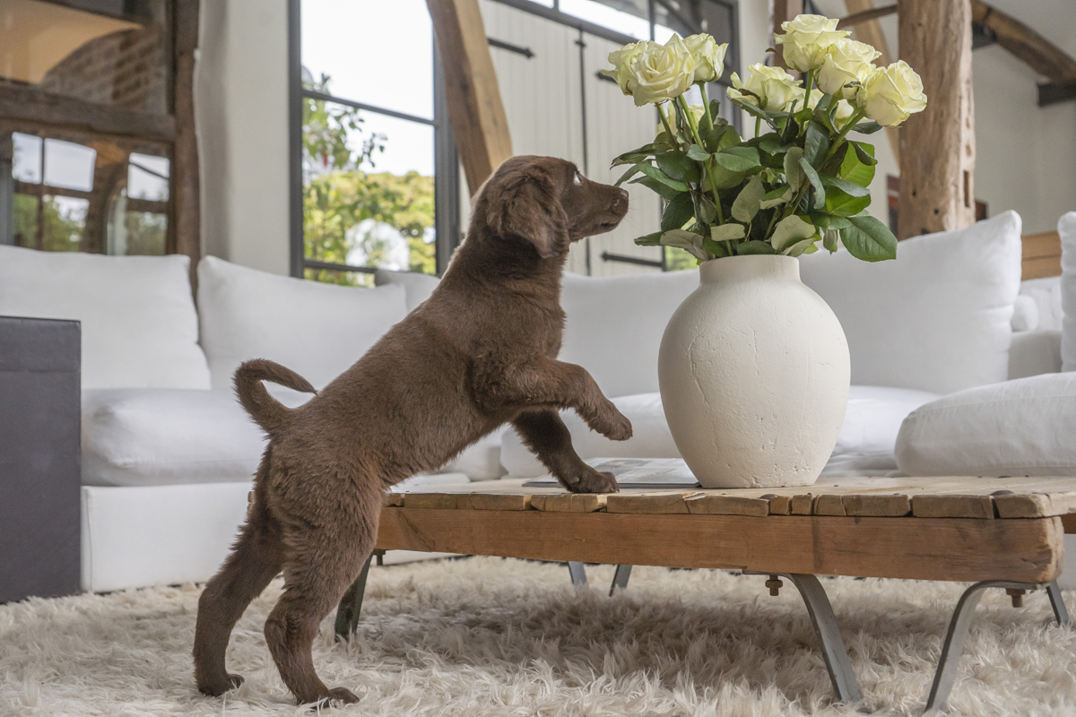Hat dein Welpe Spielzeug zur Verfügung, lernt er so, dass es Objekte gibt, mit denen er sich beschäftigen, auf denen er herumkauen und die er herumschleppen darf. So fällt es ihm leichter, deine Schuhe oder andere Dinge, die nicht für ihn geeignet sind, liegen zu lassen. Dennoch musst du natürlich beim Einzug deines Welpen darauf achten, die Wohnung „hundesicher“ zu machen. Denn er muss ja erst noch lernen, dass die Fernbedienung für ihn verboten ist, und dass es gefährlich für ihn wird, wenn er Kabel durchbeißt, Blumenvasen herunterwirft oder die Pflanzen in deinen Blumentöpfen frisst. Erkundige dich daher, welche Pflanzen giftig für deinen Hund sind (wie z. B. Christstern oder Ficus). Das gleiche gilt auch für Lebensmittel, an die dein Hund eventuell herankommt. Neben Macadamianüssen, die für Hunde sehr gefährlich sind (4 Nüsse sind für einen 15 kg schweren Hund bereits tödlich), möchte ich an dieser Stelle noch den Birkenzucker (Xylit) erwähnen, der heutzutage in vielerlei Keksen und Kuchen verwendet wird. 30 Gramm hiervon sind für einen 15 kg schweren Hund bereits tödlich! Und hier noch ein Tipp für alle Labrador-Halter:innen bzw. alle Halter:innen von Hunden mit kräftiger Rute, die von diesen gern und weiträumig wedelnd eingesetzt wird: Alle beweglichen Gegenstände in Höhe der Rute deines Hundes solltest du wegräumen, vor allem, wenn diese kaputtgehen, wenn sie vom Tisch gewedelt werden!