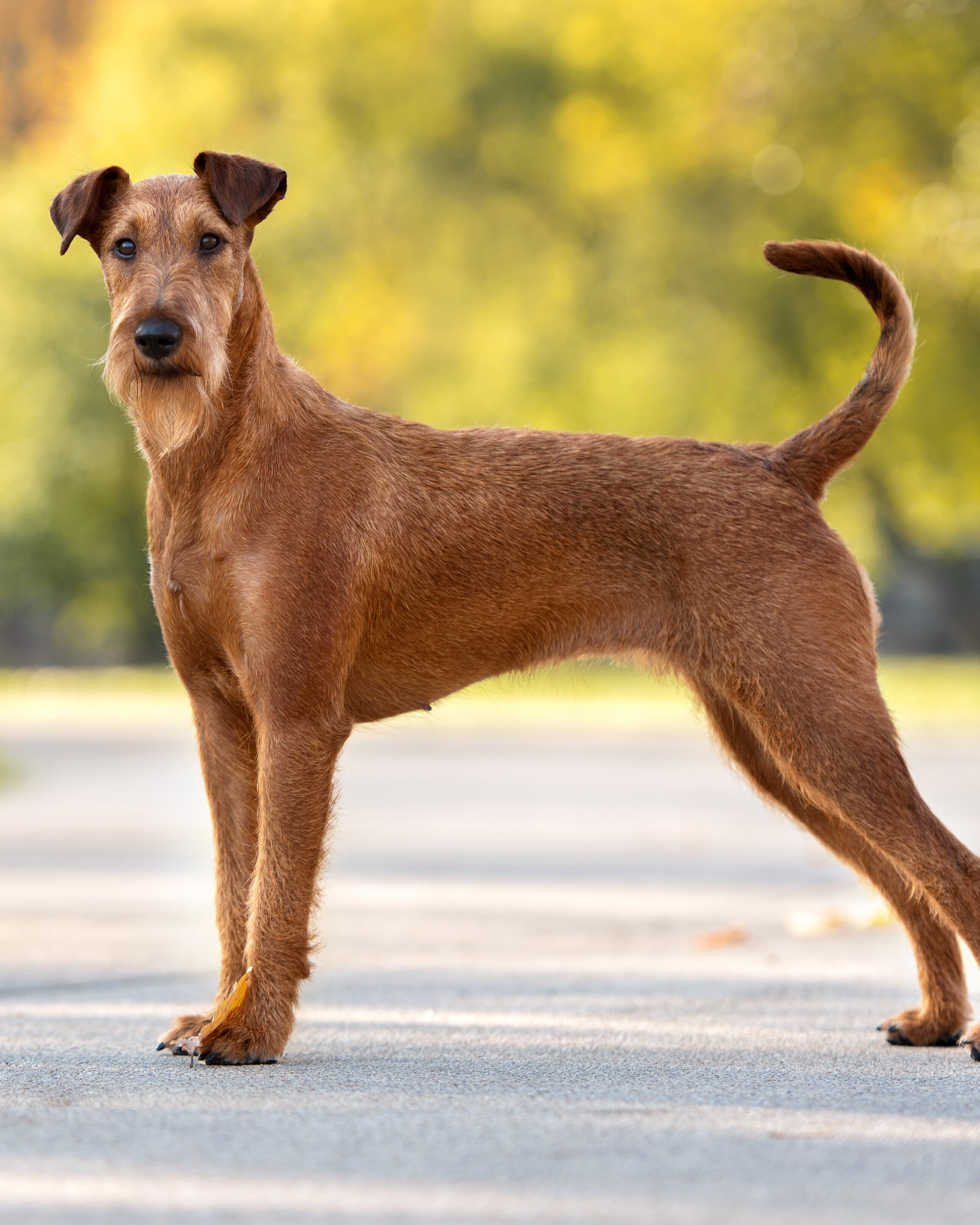 Zunächst zur jagdlichen Motivation: Alle Terrier haben ihren Namen von dem lateinischen Wort „terra“ (Erde). Denn Terrier jagen, indem sie in der Erde graben, um zum Beispiel Nagetiere, Dachse, Füchse oder Kaninchen zu fangen. Der heutige Irish Terrier ist im Herzen immer noch ein Rattenfänger und hat ein starkes Verlangen, Raubzeug aufzuspüren und zu töten. Aber er jagt auch sich schnell bewegende Tiere auf Sicht. Wenn der Irish Terrier nicht jagdlich geführt wird, braucht er also unbedingt eine alternative jagdliche Auslastung, Training von Impulskontrolle und Rückruf, körperliche Auslastung sowie Konsequenz im täglichen Umgang mit seinen Menschen. Auch beim Zusammenleben mit anderen Haustieren muss man den Aspekt der jagdlichen Motivation bedenken. Irish Terrier können zwar lernen, mit Katzen auszukommen, aber bei kleineren Haustieren wie Mäusen, Ratten und Hamstern ist es eher unwahrscheinlich, dass sie diese nicht als Jagdobjekt betrachten.